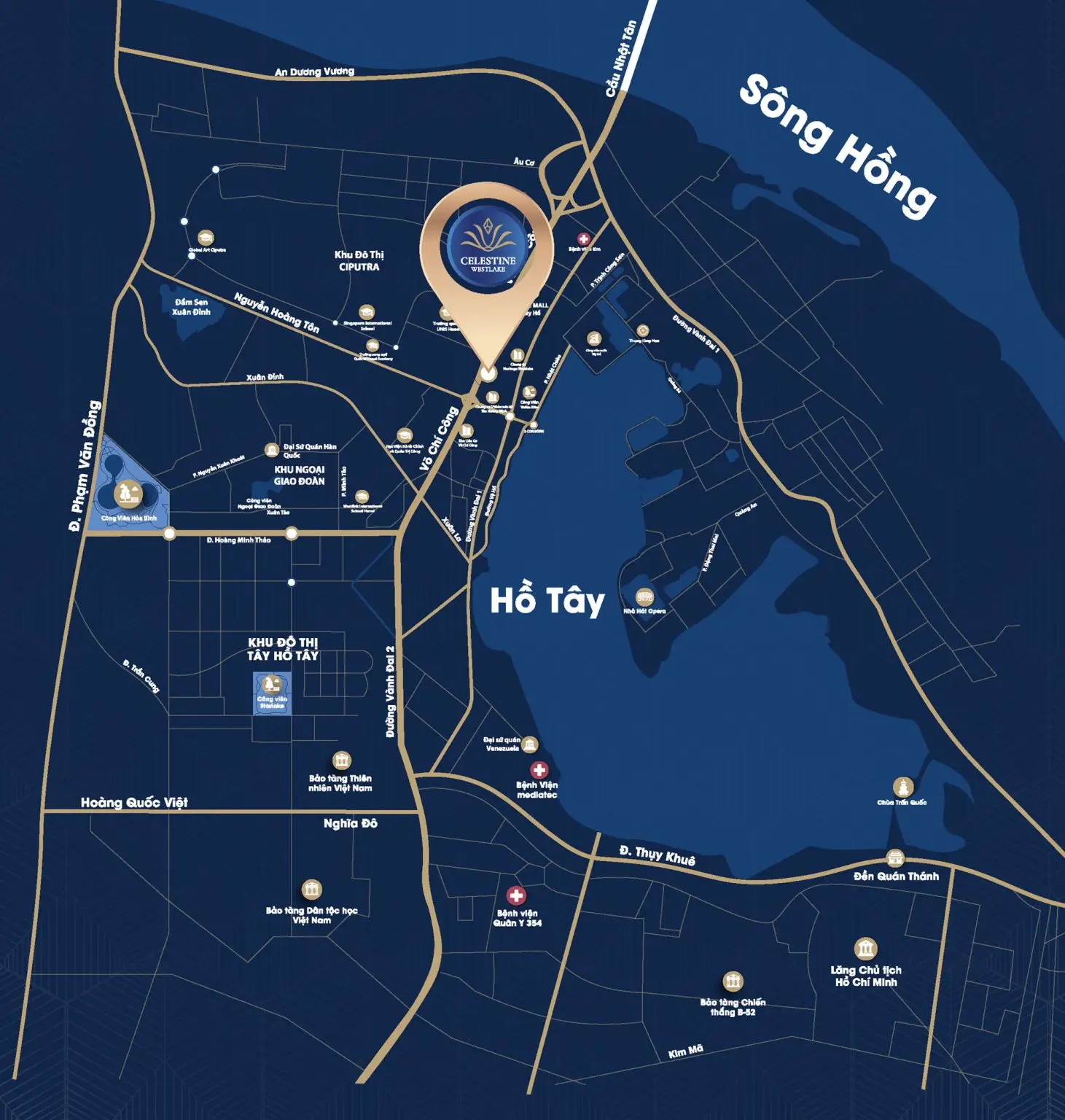 Tọa lạc tại số 300 đường Võ Chí Công – trục giao thông huyết mạch kết nối trung tâm thành phố với sân bay quốc tế – Celestine Westlake là một biểu tượng của vị thế. Nằm tại trung tâm phường Tây Hồ, dự án được thừa hưởng một cộng đồng dân cư tinh hoa gồm các nhà ngoại giao, chuyên gia nước ngoài, và giới trí thức, tạo nên một môi trường sống văn minh, an toàn tuyệt đối và đầy giá trị.